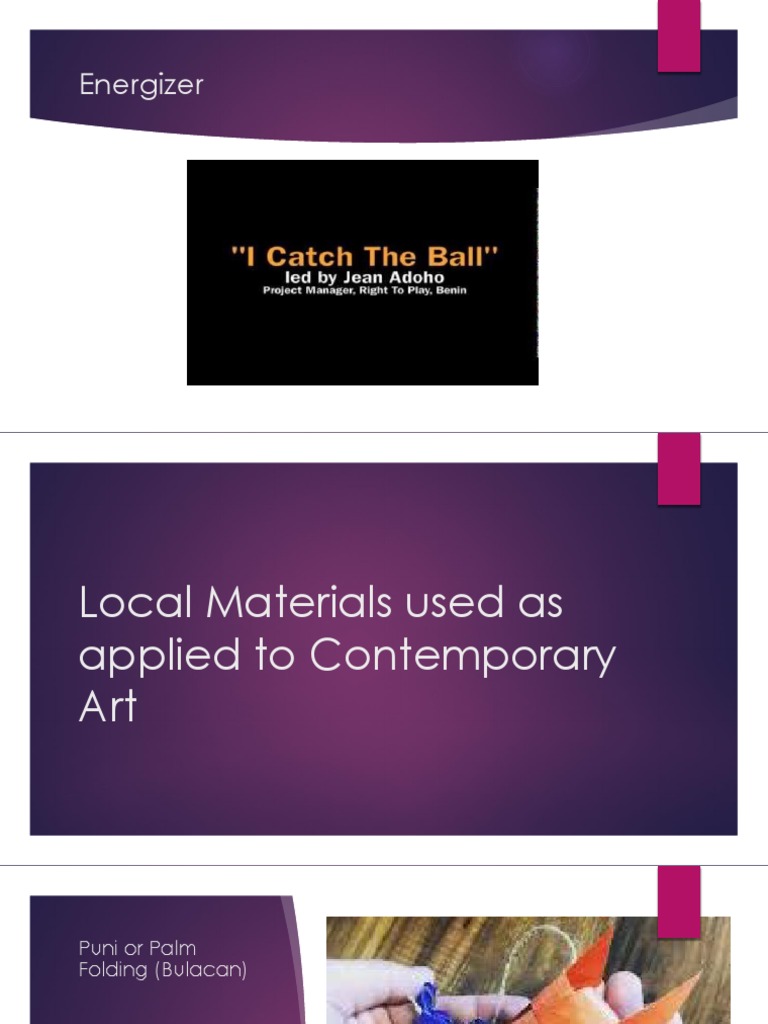 Local Materials Used as Applied to Contemporary Arts - Free download as Powerpoint Presentation ppt pptx PDF File pdf or view presentation slides online. Examples of Puni Sinangkaban or Bamboo Art Sinangkaban is a local term for bamboo arches. Search for specific art movements to learn more about the materials and processes used by artists aligned with that movement.